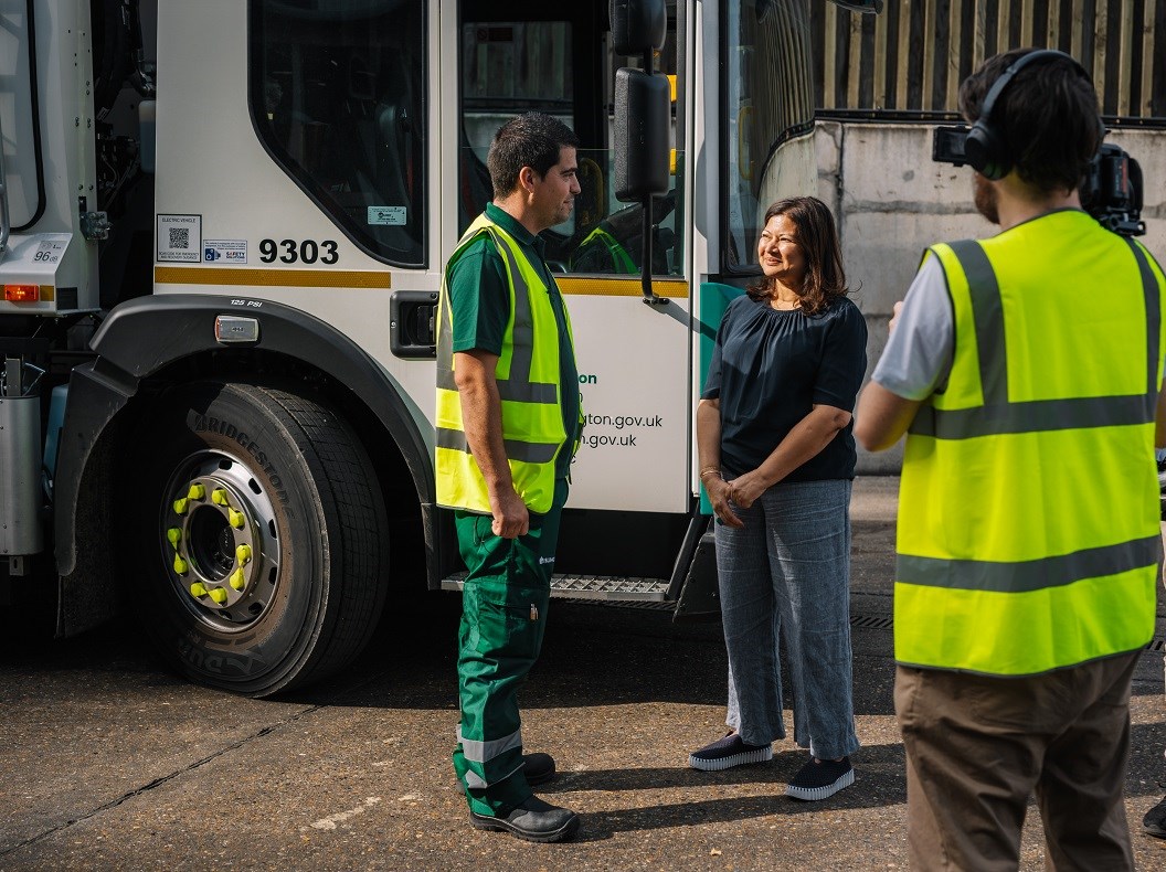 Shirley Rodrigues speaks with a member of staff at the Waste and Recycling Centre, in front of an electric waste collection vehicle.jpg