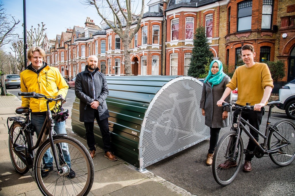 Pictured from left to right are: Cllr Rowena Champion; Mike Tsui (from bike hangar supplier Cyclehoop); Selina Talukdar (Active Travel Programme Manager at Islington Council) and Bart Smith (Active Travel Programme Officer at Islington Council)