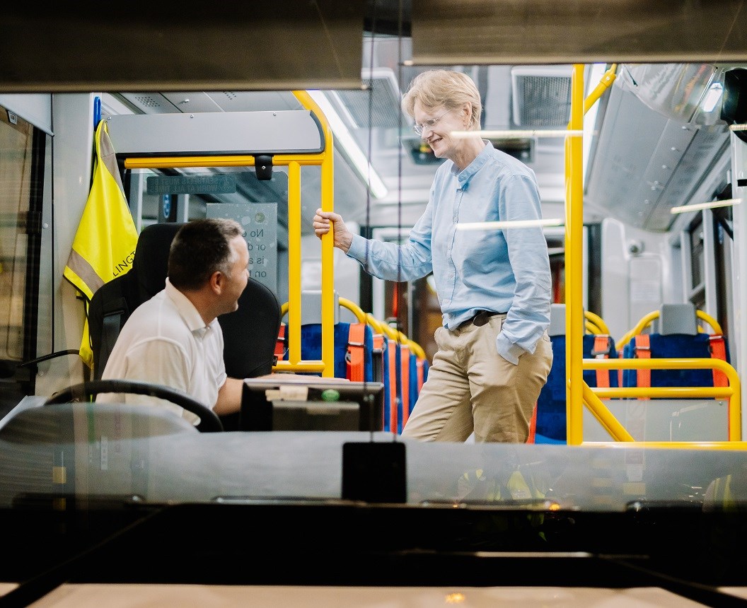 Cllr Champion talks with a member of staff at the Waste and Recycling Centre, on a fully electric bus